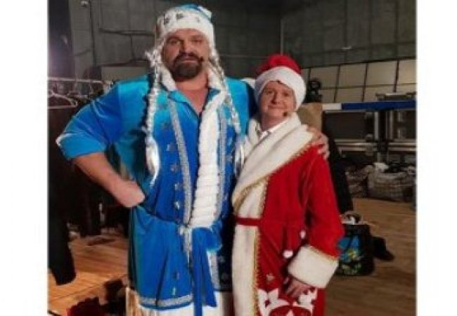 Знаменитий український стронгмен Василь Вірастюк у новорічному костюмі Снігуроньки взяв інтерв'ю в улюбленця жінок, співака Олега Винника.