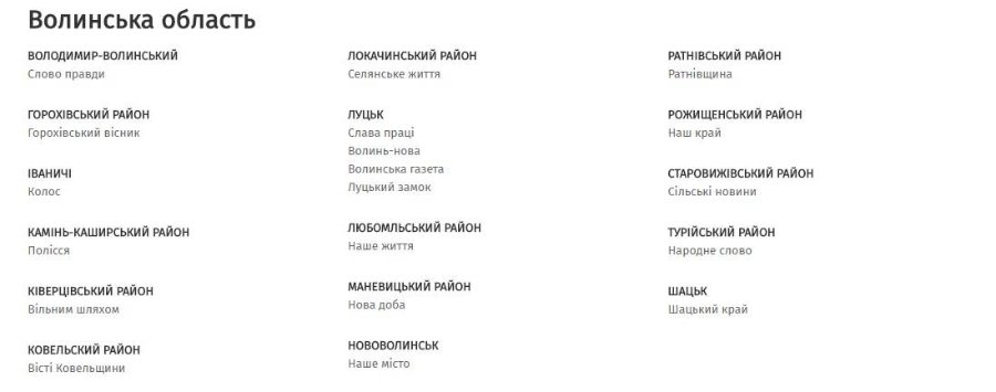 В базі сайту – 15 волинських «районок». Крім того, в переліку – 4 луцькі видання.