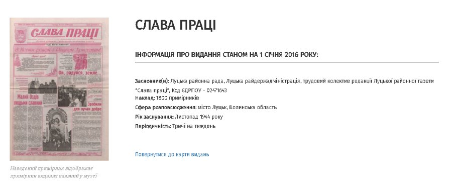 Поки цей процес триває, кожен в режимі онлайн може ознайомитися з індивідуальною карткою видання на сайті, дізнатися про його засновників, сферу розповсюдження, стан реформування та навіть погортати і завантажити відсканований примірник.