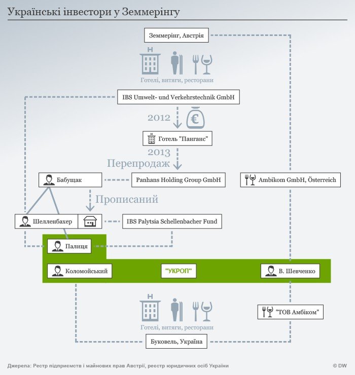 Формально Panhans Holding - нинішній власник готелю "Панганс" та інвестори, які ховаються за Бабущаком, - не мають нічого спільного з операцією купівлі-продажу, яка мала місце 2012 року, щодо якої розслідується справа за підозрою у відмиванні коштів. Холдинг купив готель лише роком пізніше. Водночас, як з'ясувала DW, за тодішніми покупцями і нинішніми власниками, вочевидь, стоять ті самі люди. Засновниками IBS були австрійський бізнесмен і політик Томас Шелленбахер та українець Ігор Палиця, який також багато років активний як у бізнесі, так і в політиці. Їх пов'язує давня дружба, визнав Шелленбахер 2015 року у розмові з журналістами видання "Profil".