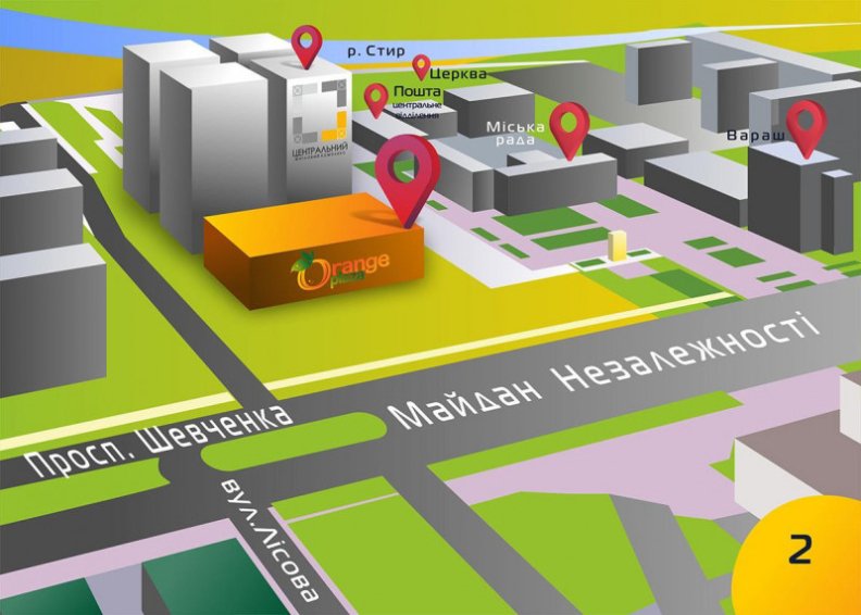 Забудовник спеціально обрав зручне місце розташування для Orange Plaza: центр міста. Це логістична перевага, адже жоден мешканець міста не омине ТРЦ, а майбутні орендарі та власники торгівельних площ матимуть центральне розміщення, легкий доступ та гарантований потік клієнтів.