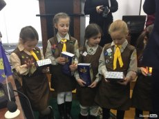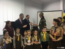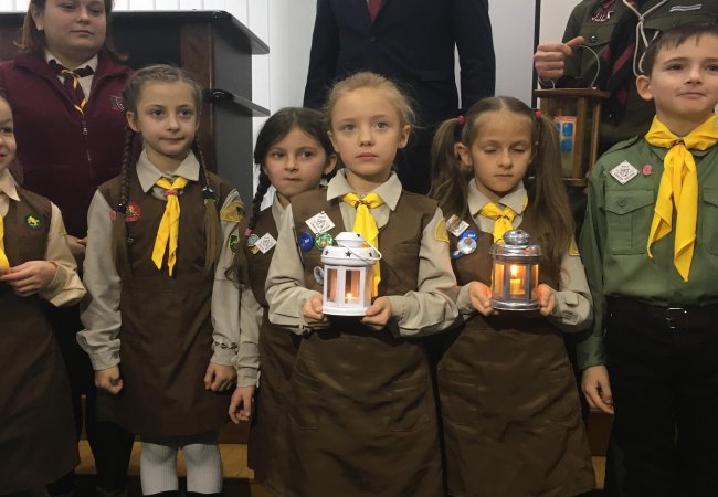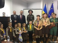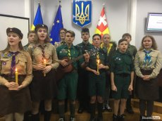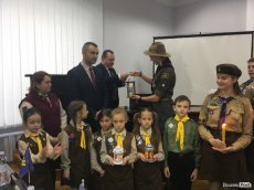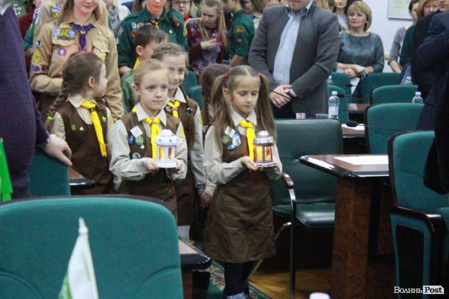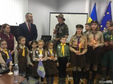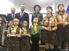 Потім пластуни заспівали пісню про вогонь. Пустовіт подякував їм за те, що вони дотримуються традицій, не забувають про депутатів і вручив усім невеличкі подарунки – солодощі. Пластуни роздали всім присутнім у залі по свічці і кожен охочий запалив її святим вогнем.