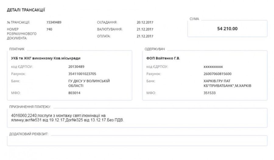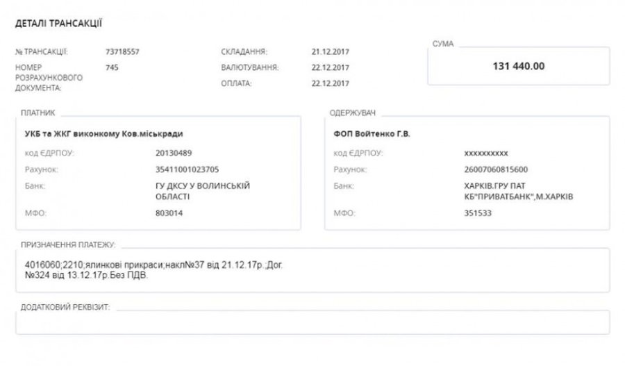 Офіційним платником виступило управління капітального будівництва та житлово-комунального господарства виконкому, а одержувачем цих коштів – харківський підприємець Войтенко Г.В.