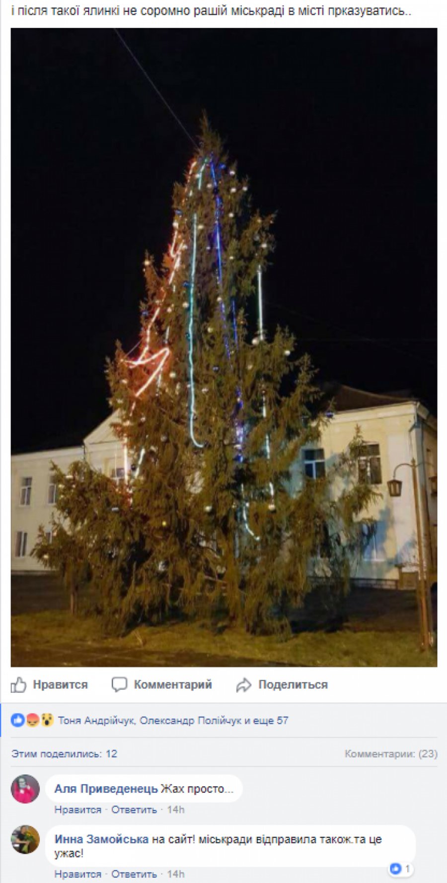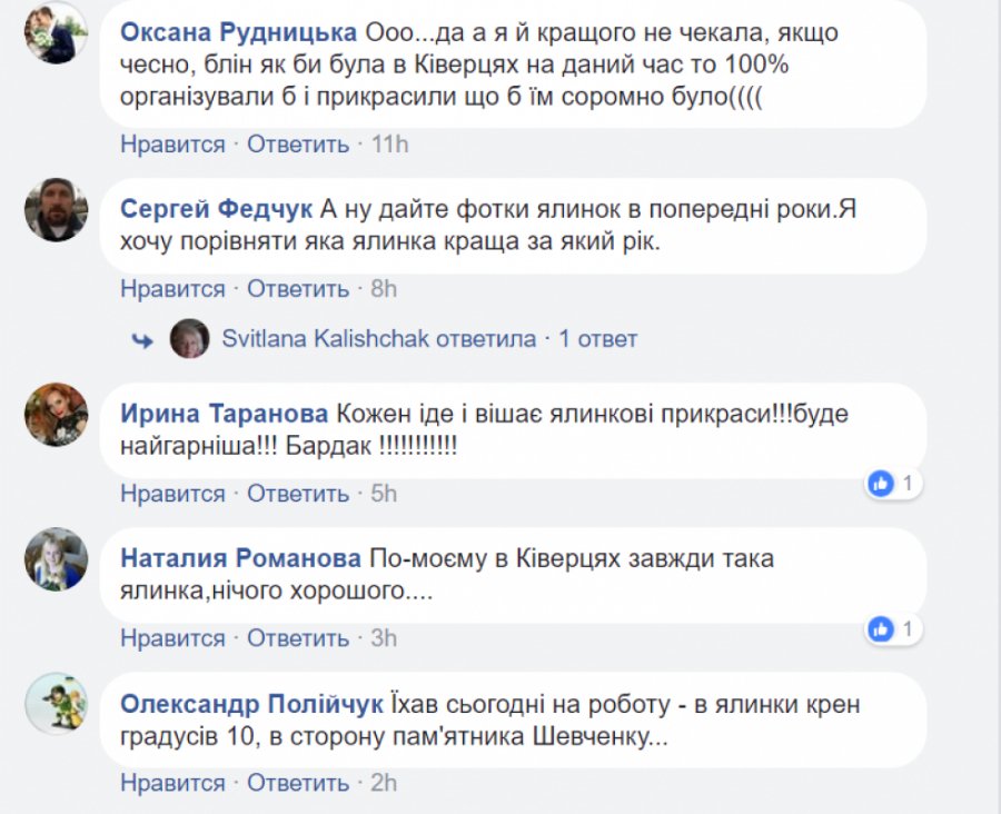 Однак, більшості ківерчан нинішній стан ялинки відверто не подобається. Про це вони пишуть в мережі Facebook.
