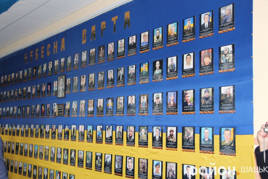 На величезному жовто-блакитному полотні розміщені фото майже двохсот волинян, котрі загинули протягом чотирьох років російсько-української війни, яка триває на сході України. Серед них – портрети двох жителів Шацького району – Сергія Грибука, жителя села Омеляне, та шачанина Сергія Мокренка, який загинув 28 лютого цього року на Світлодарській дузі. Недарма меморіальну стіну дирекція школи вирішила встановити в коридорі поблизу класу, де навчався Герой.