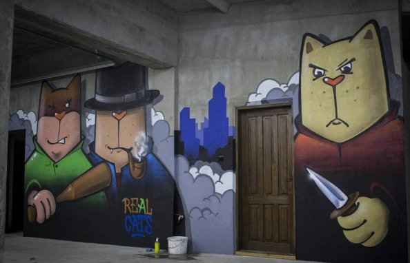 У луцькому гаражі з’явилися величезні графіті з котами-розбійниками.