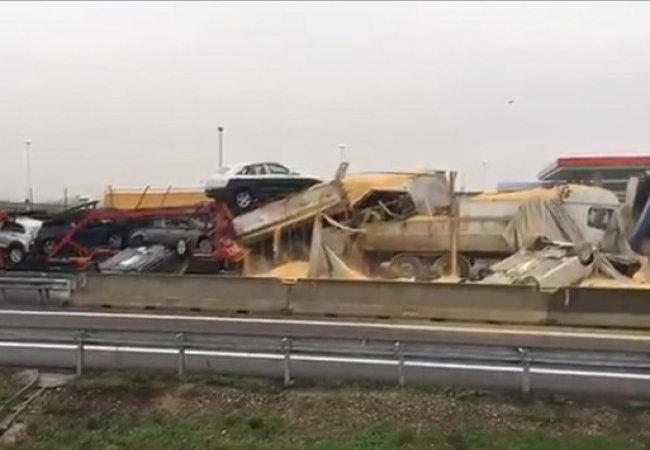 В Італії сталася масштабна ДТП: тут зіткнулися дві вантажівки, легковий автомобіль і бензовоз.