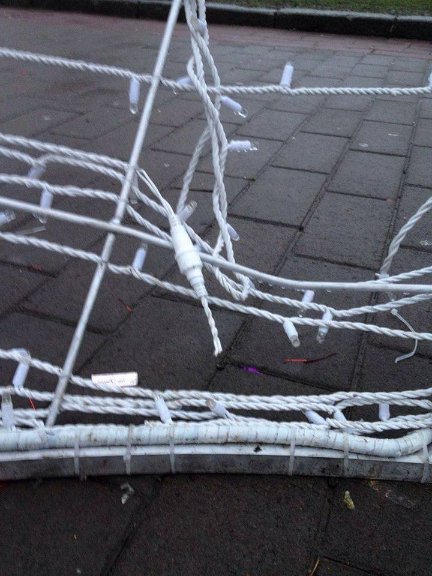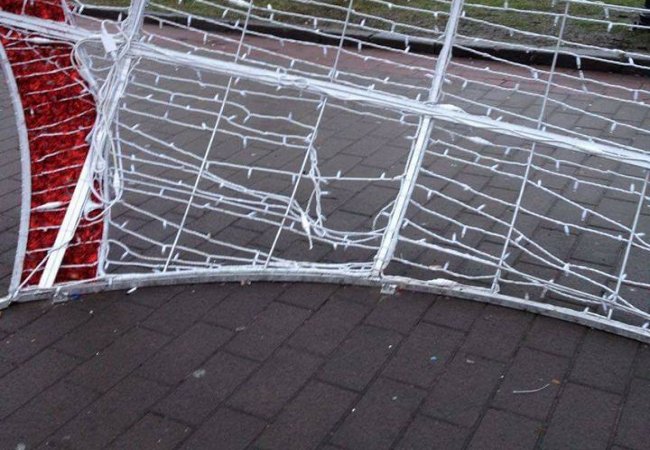 В стильній кулі та сяючій арці, порізали гірлянди. Також хулігани відбили деталь в одній із кованих фігур, що розміщені поблизу головної ялинки міста.