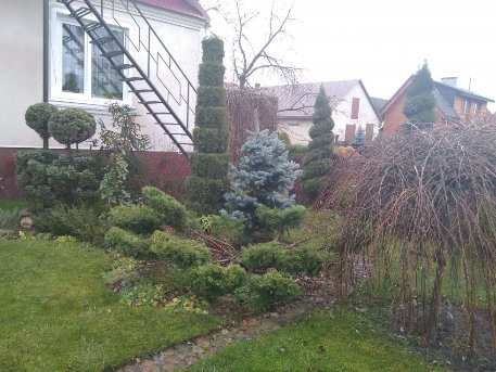 Проводячи екскурсію по своєму подвір’ю, де все теж зроблене її руками, дбайливо торкається кожного дерева. Тут звичайна сосна має чудернацьку стрижку, а там ялівець у формі зірки. Високі туї мають серпантинові зачіски, а зі сторони вулиці кілька кругленьких дерев, мов глобуси.