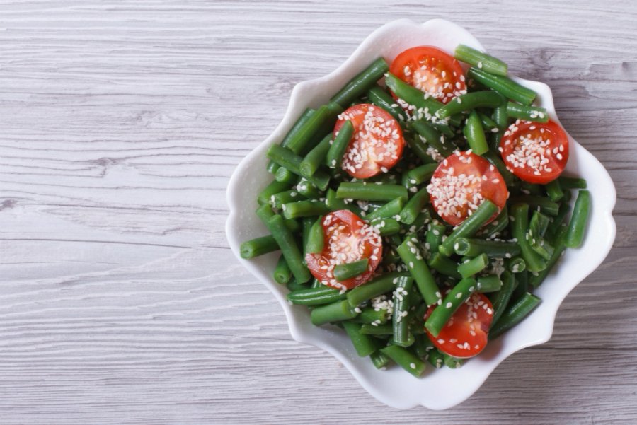 Відваріть квасолю протягом 2-3 хвилин, потім перекладіть її в салатницю, додайте нарізані на половинки помідори, рубаний базилік, полийте оливковою олією і лимонним соком, посипте кунжутом, сіллю, перцем і перемішайте. Подавайте теплим.