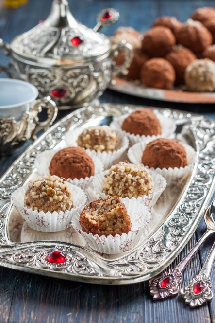 Промийте і обшпарте окропом сухофрукти. Потім подрібніть у блендері або м'ясорубці. Також подрібніть волоські горіхи, а фундук залиште цілим. Змішайте горіхи із сухофруктами і починайте формувати цукерки: візьміть горішок фундука і скачайте навколо нього кульку з раніше приготованої маси. Готову цукерку обваляйте в какао-порошку або кокосовій стружці. Щоб цукерки були солодшими, до начинки можна додати мед.