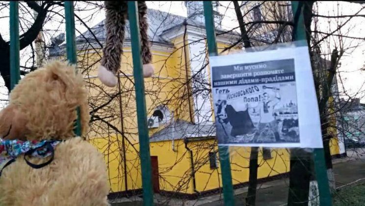 Разом з ведмедиками та ляльками, активісти розповсюджували листівки з закликами «Геть московського попа» та «Ми мусимо завершити розпочате нашими дідами-прадідами».