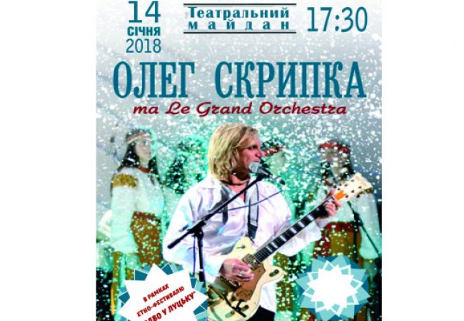 В рамках міжнародного етно-фестивалю «Різдво у Луцьку» 14 січня на Театральному майдані лучан та гостей міста віншуватиме Олег Скрипка спільно з Le Grand Orchestra.