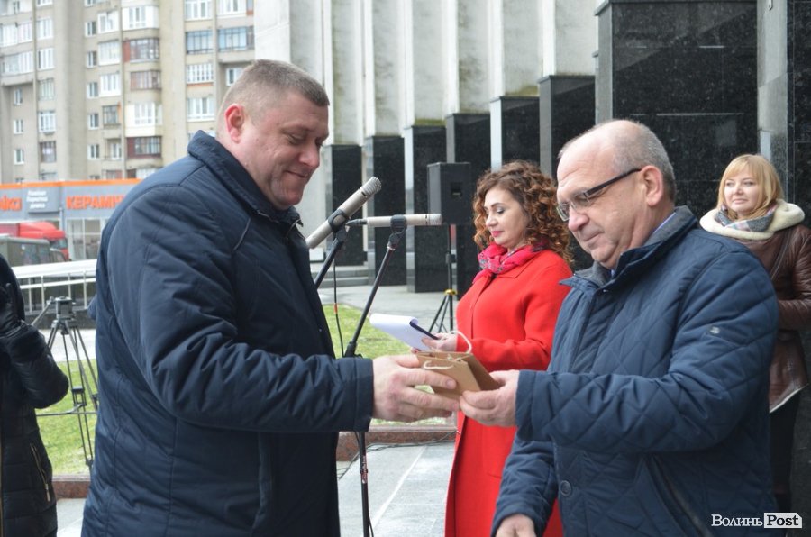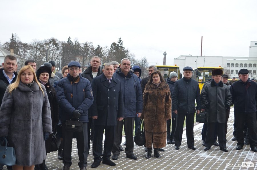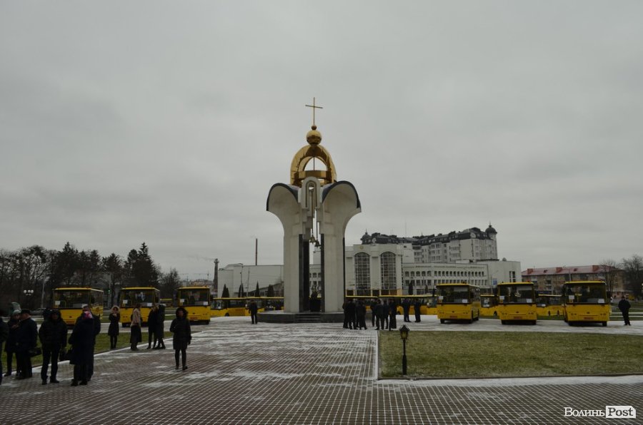 15 новеньких, великих та комфортних автобусів «Богдан» вишикували на Київському майдані. Поруч зібралися освітяни з усієї Волині.