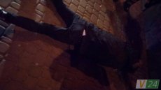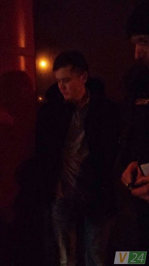 Поліція охорони прибула на виклик, залишивши машину біля клубу. Двоє нетверезих молодиків підійшли до неї, спочатку просто роблячи селфі. В якийсь момент один з молодиків взяв камінь – і розбив заднє скло, знімаючи це на відео.