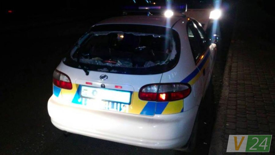 У Луцьку двоє нетверезих молодиків побили заднє скло у машині поліції, знімаючи це на камери телефонів.