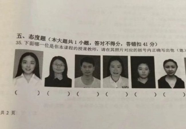 Студентам професійного коледжу культури та зв'язку міста Сичуань під час екзамену роздали документ з фотографіями сімох людей і попросили вказати, хто з сімки - їхній викладач і підписати його ім'я під світлиною.