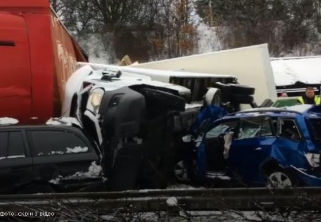 Серед машин, які потрапили в ДТП, багато вантажівок. Постраждали близько 10 людей.