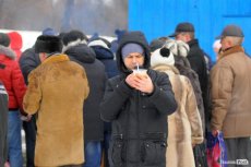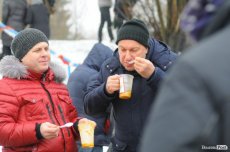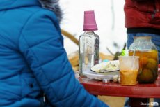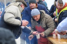 Зігріваються люди алкогольними напоями, переважно коньяком. Також на березі зварили великий казан кулішу, тож всі охочі підходять і частуються.