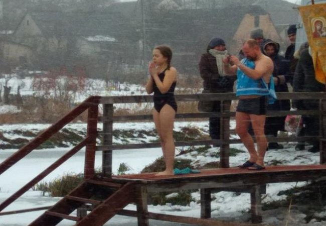 Природа не жаліла сміливців, адже був сильний вітер та сипав сніг. Проте на ставок міста зійшлось досить багато людей.
