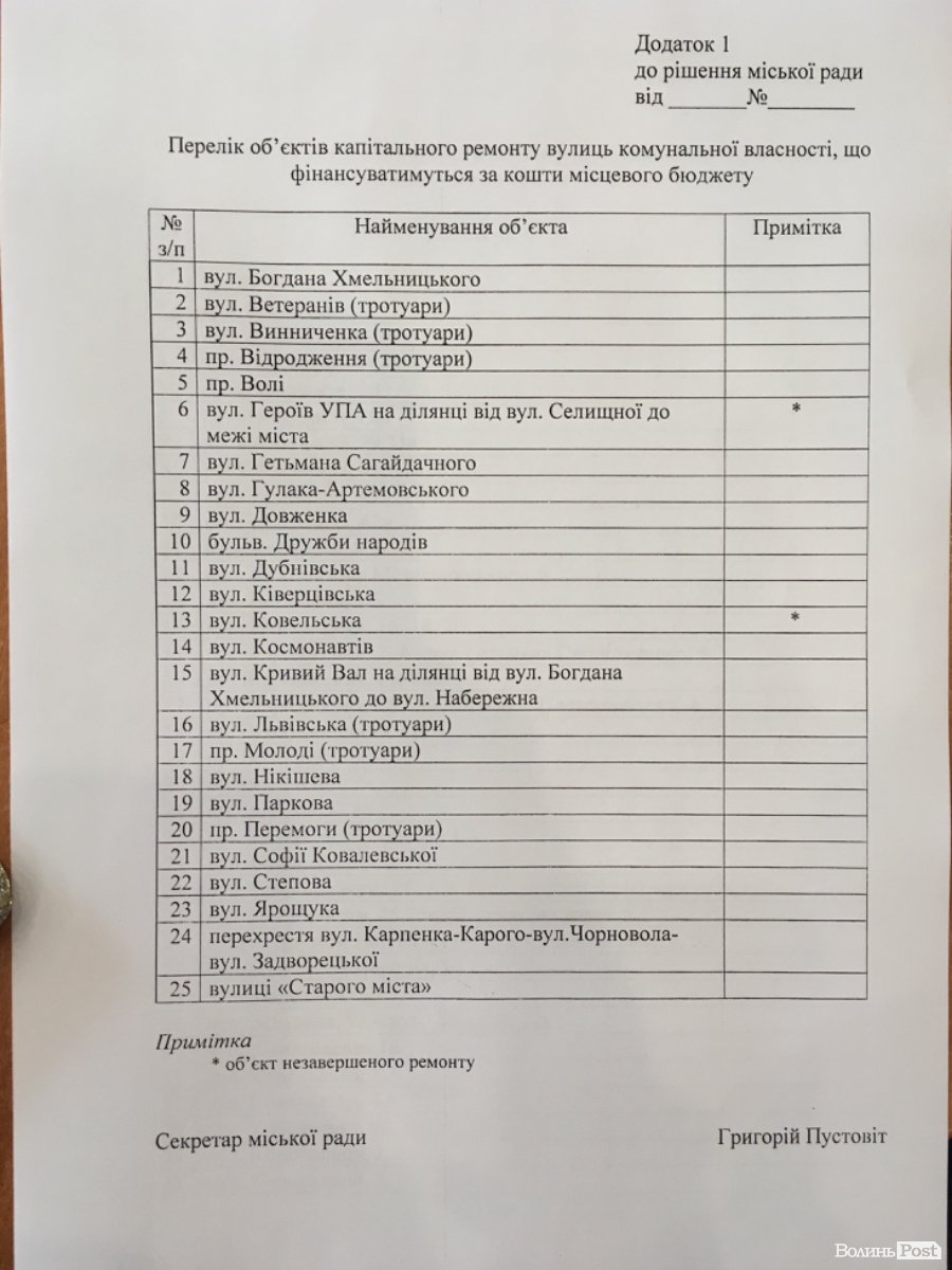 У Луцькраді представили список вулиць комунальної власності, які ремонтуватимуть за кошти місцевого бюджету.