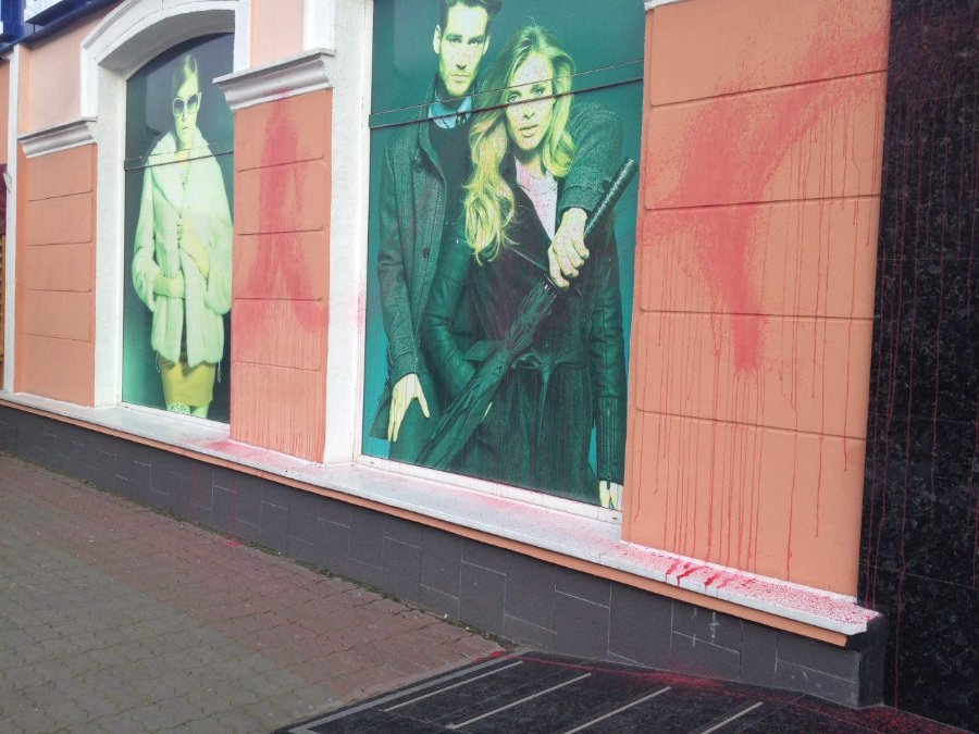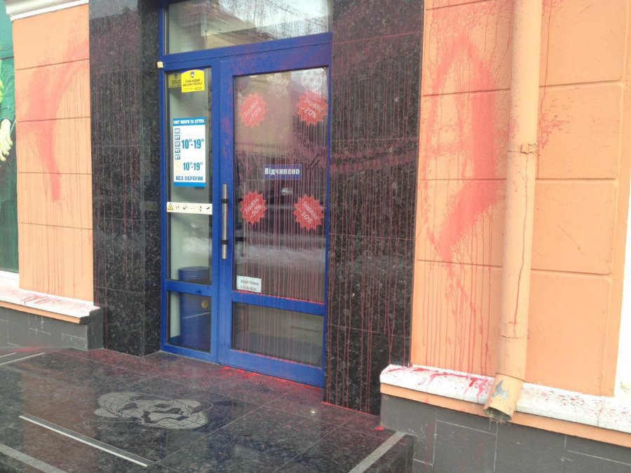 Крім того, невідомі пошкодили майно і на проспекті Волі, 17: магазин облили червоною рідиною. Поліція шукає зловмисників.