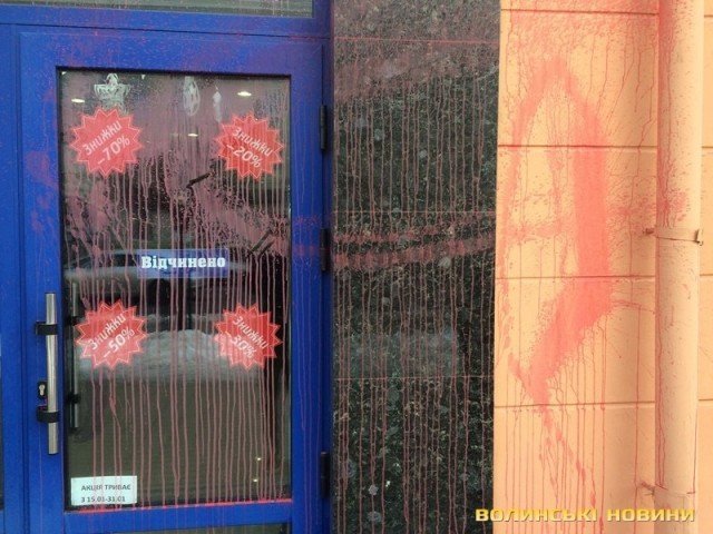 У Луцьку червоною фарбою облили магазин «Світ шкіри та хутра».