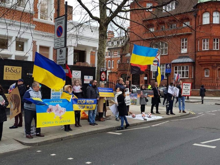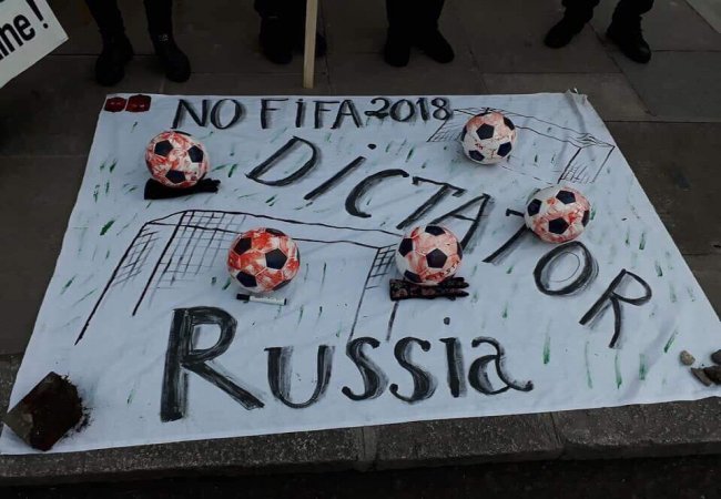 «Ми вимагаємо забрати у Росії чемпіонат світу з футболу. Рішення ФІФА провести чемпіонат світу було куплено корупційним режимом за криваві гроші», - наголосили учасники маніфестації, яка пройшла перед будівлею посольства РФ у Лондоні.