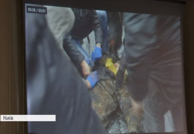 «Перебував обличчям вверх до вулиці Інститутської, поранення дістав у праве плече і дуже великий перепад по висоті раневого каналу, це вказує, що в нього стріляли з готелю «Україна». Ми бачимо непоодинокі випадки, коли з готелю – з різних поверхів – вогонь вели на ураження, як мітингувальників, так і правоохоронців. У готелі «Україна» були снайперські пари невідомого походження», – каже адвокат підозрюваних спецпризначенців Олександр Горошинський.