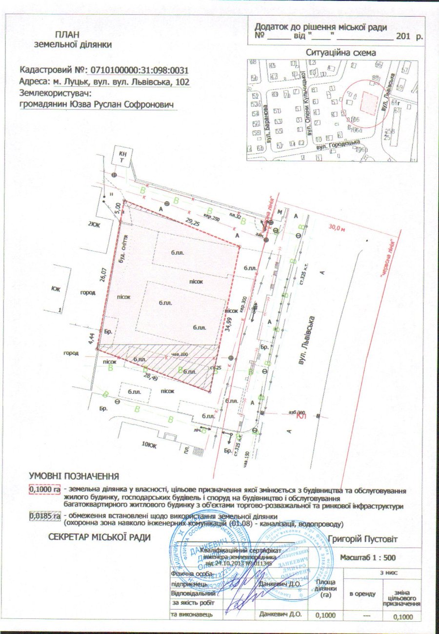 До міськради звернувся підприємець Руслан Юзва із проханням змінити цільове призначення його ділянки площею 0,1000 га. Раніше ділянка була призначена для будівництва та обслуговування жилого будинку, господарських будівель і споруд. Проте Юзва подав прохання змінити його на «будівництво і обслуговування багатоквартирного житлового будинку з об’єктами торгово-розважальної та ринкової інфраструктури».