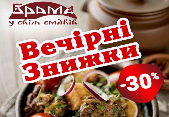 У ресторації «Брама» - неймовірна акція. Відтепер пізні вечері стануть на 30% доступнішими.