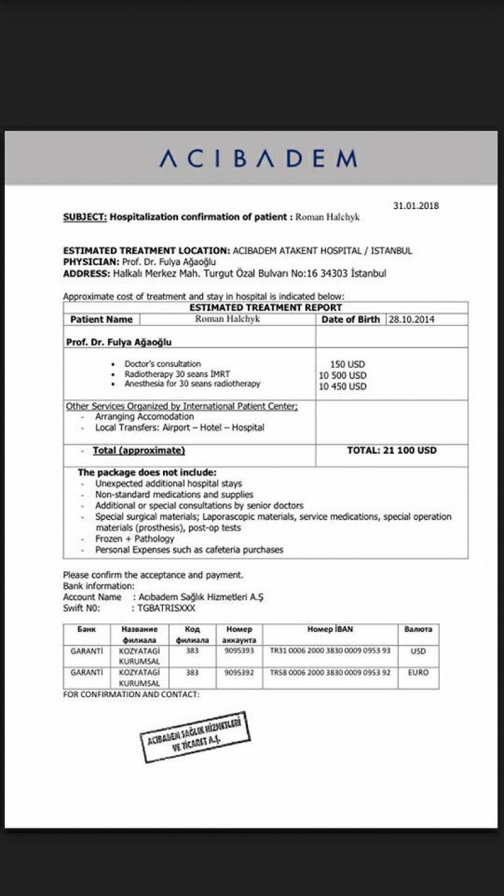 На лікування сім’я вже витратила близько 10-ти тисяч доларів. Батьки не покладають рук і разом із сином боряться за життя. На курс променевої терапії 5 лютого відправляться в турецьку клініку «Аджібаден» в Стамбулі. Саме лікування коштує 21 тисячу доларів.