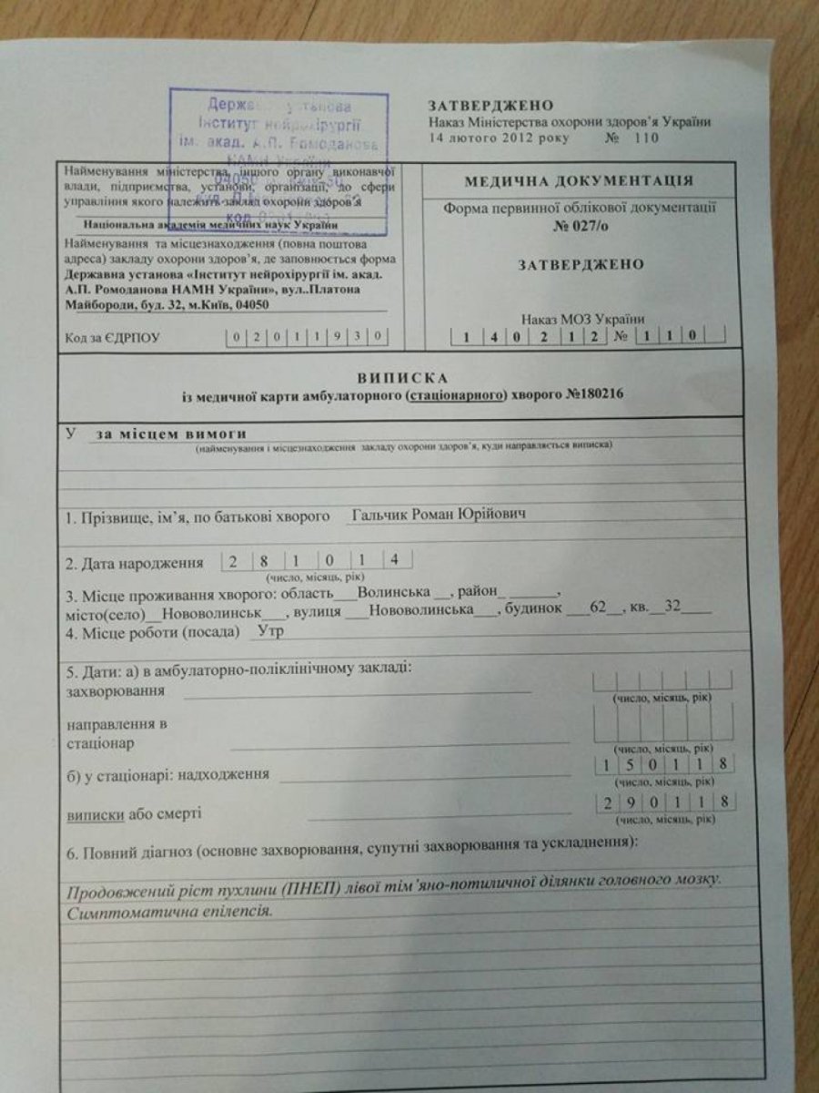 Батьки самостійно знайшли лікаря та у Києві в інституті нейрохірургії 18-го вересня 2017-го року Роман переніс першу операцію. Усю пухлину вирізати не вдалося, так як вона знаходиться біля життєво важливих органів. Далі слідували 3 курси хіміотерапії, які на жаль не допомогли. З діагнозом кістозно-солідна пухлина лівої тім’яно-потиличної ділянки головного мозгу хлопчика готували до другої операції.