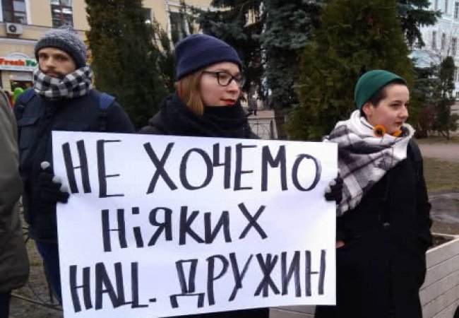 Серед лозунгів, які учасники акції проголошують - "Не хочемо ніяких нацдружин", "Там, де ходять строєм, свободи не буде", "Тітушкуваті нацдружини не потрібні", і т.д.