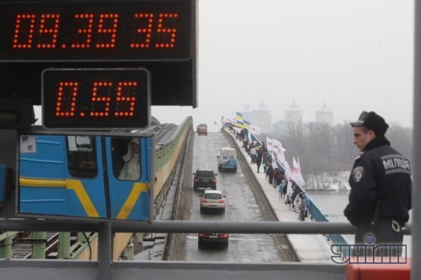 У День Соборності київська організація партії "Батьківщина" утворила живий ланцюг "Юлі - волю! Україні - волю!" по обидві сторони мосту Метро.