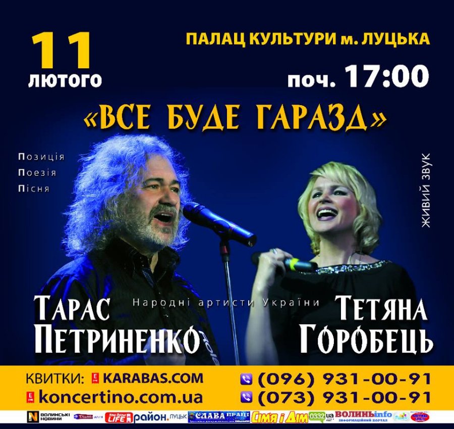 Що обіцяють: Тарас Петриненко виступить у Луцьку із концертною програмою туру «Все буде гаразд». До концертної програми туру увійшли як нові твори майстра, так і пісні, що вже стали класикою: «Україна», яка давно перетворилась на своєрідний неофіційний гімн України, «Пісня про пісню», «Господи, помилуй нас», «Любов моя», «Новий рік», «Ми не закінчили розмову», «Зорепад» та ін. Придбати квитки можна у касі драмтеатру або на сайті. Телефон для довідок – (096) 931-00-91, (073) 931-00-91