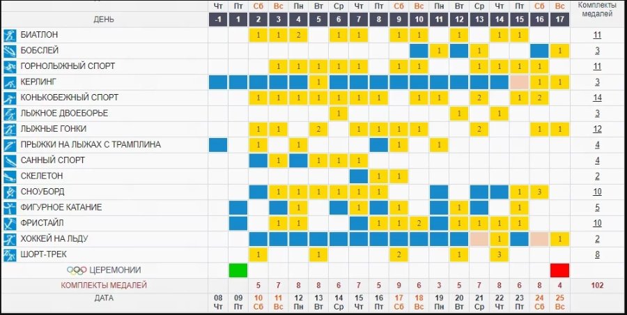Опублікувати повний розклад змагань Олімпіади 2018, яка відбудеться з 9-го по 25-е лютого в південнокорейському Пхенчхані.