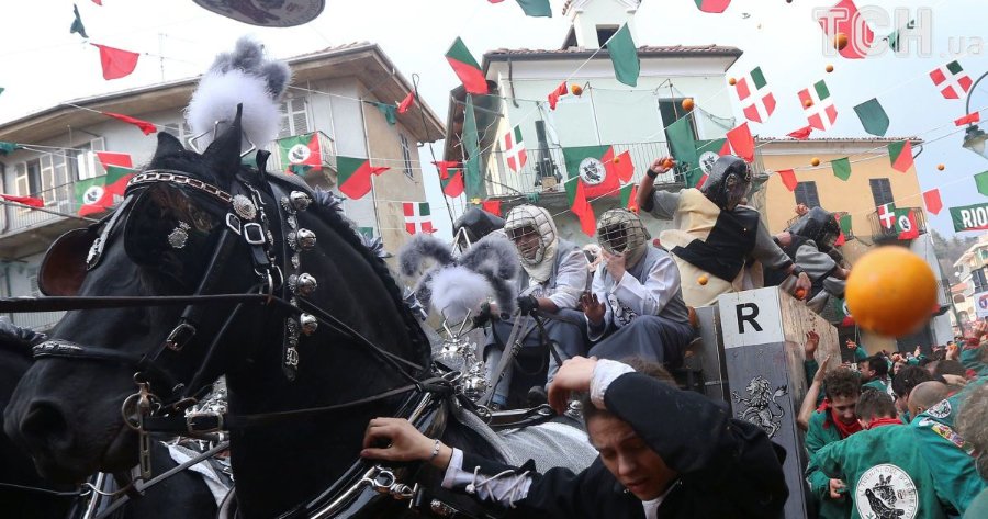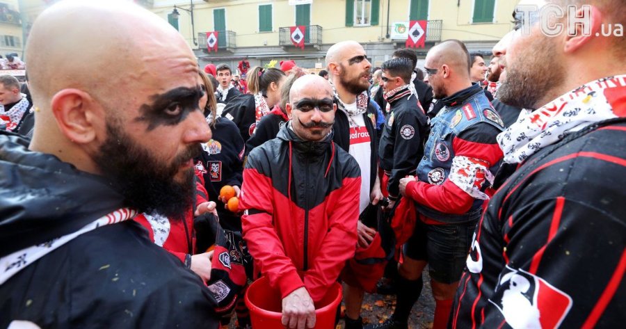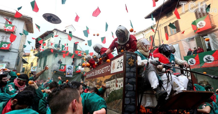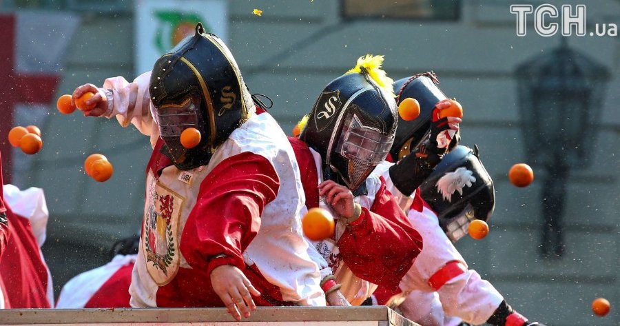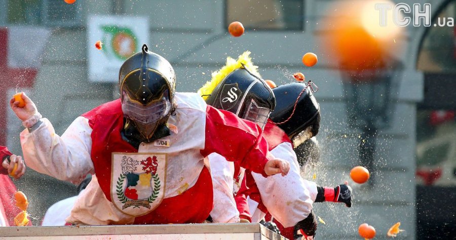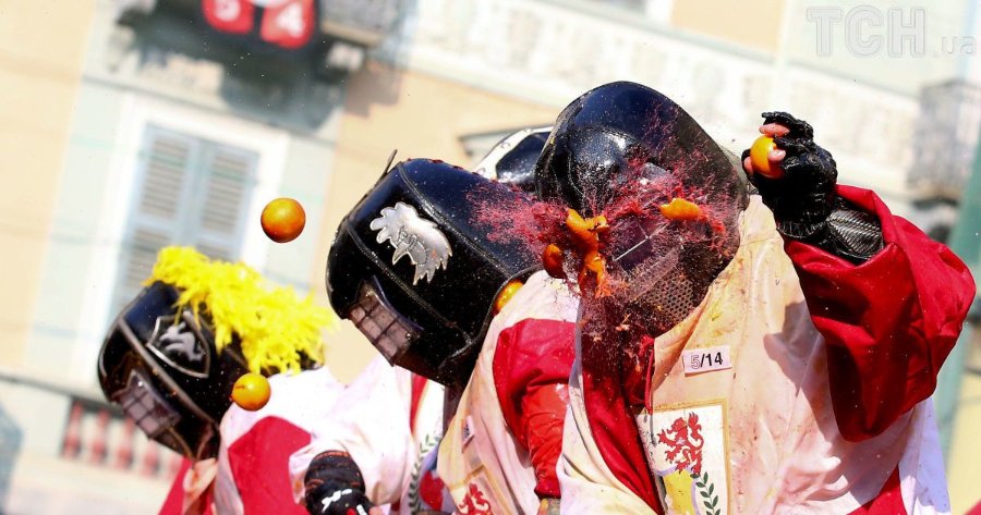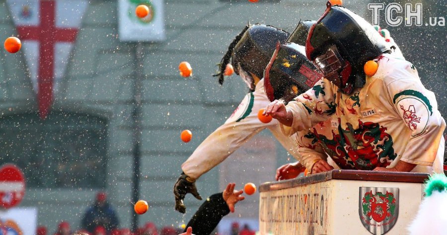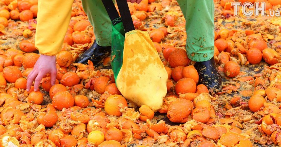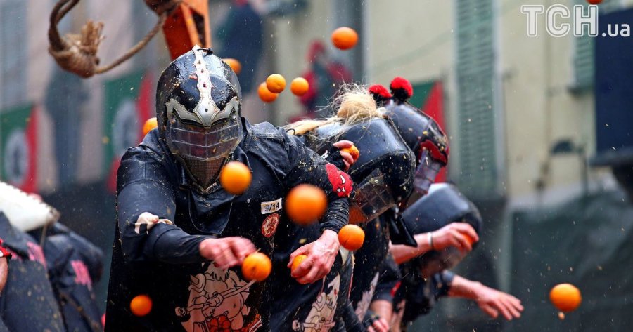 У шоломах та під зливою помаранчу: італійці влаштували апельсинове "побоїще".