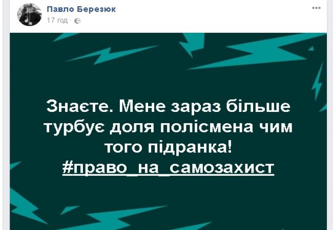 Люди стали на захист поліцейського, який постраждав через зауваження чоловікам, що вживали алкоголь у Центральному парку культури і відпочинку імені Лесі Українки. На своїх сторінках вони пишуть дописи із хештегом #право_на_самозахист, а дехто ще й додає хештег #право_на_зауваження.