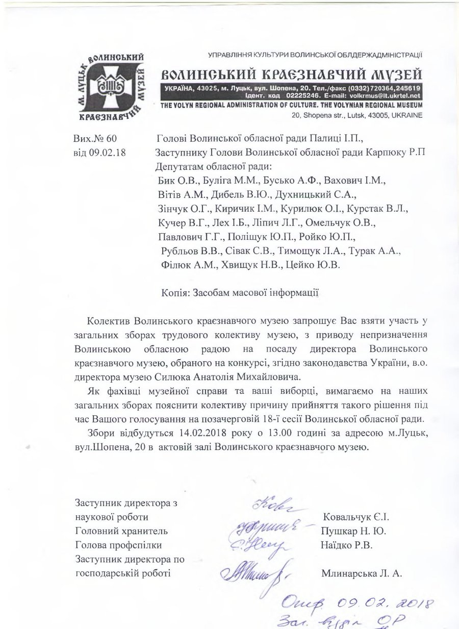 «Силюк Анатолій - ветеран музейної справи Волині й України, яких небагато. Професіонал високого класу, знаний в Україні й за її межами, він користується заслуженою повагою серед усього музейного братства. Його нагороди перелічувати не буду - вони усі заслужені. Колектив, ним очолюваний, виріс у справжню наукову установу. Директор підтримує усі наші розумні починання, виступає ініціатором конференцій, видань тощо. Сюжети музейної тематики постійно транслюються на ТБ. Ми щиро зраділи, коли дізналися, що конкурсна комісія була одностайною, рекомендувавши його на посаду директора музею. Тому звістку про те, що депутати обласної ради по суті зірвали голосування, не проголосувавши ні за ні проти кандидатури (єдиної!) А. М. Силюка сприйняли як особисту образу, як випад проти музейників області загалом», - йдеться у повідомленні.