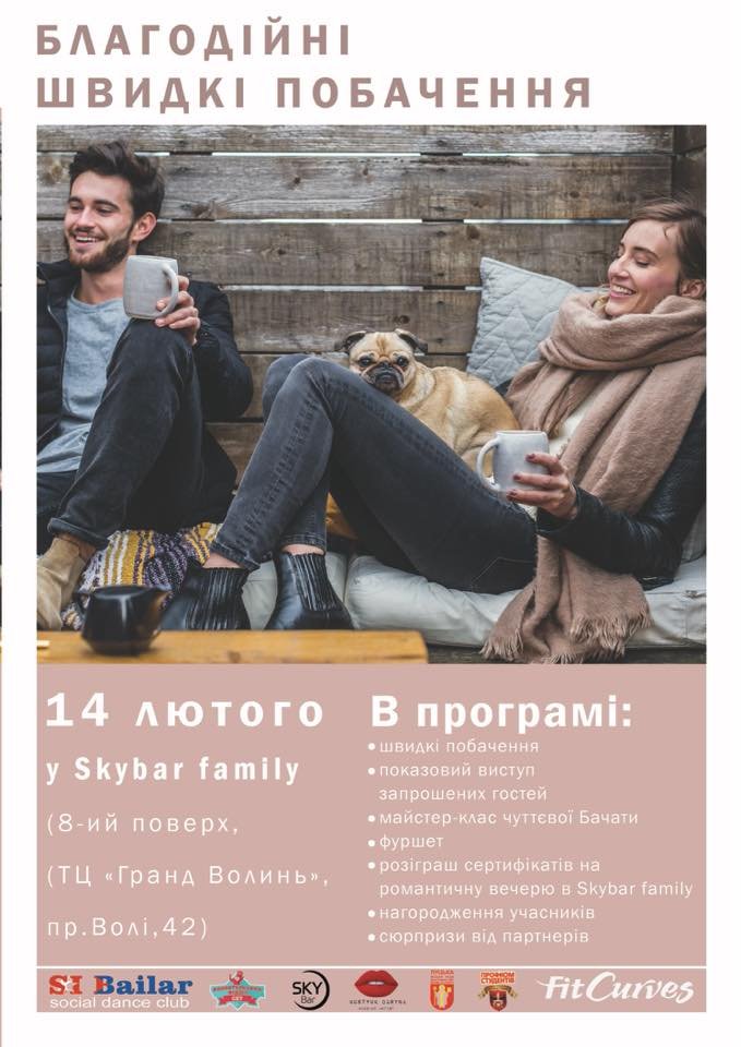 Благодійні швидкі побачення відбудуться 14 лютого в лаунж-барі Skybar family. Початок о 15:00, - повідомили організатори.