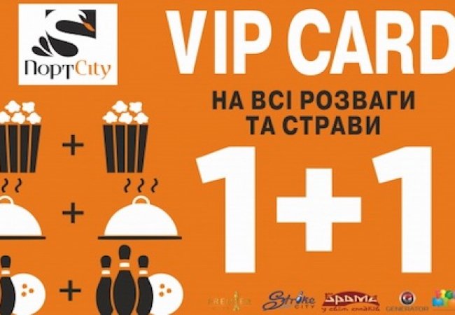 У розважальних закладах та рестораціях «ПортCity» можна отримати дві послуги за ціною однієї, адже знову стартував продаж VIP-картки, яка дає змогу економити на відпочинку, розвагах та їжі у торгово-розважальному центрі «ПортCity» та працює за системою 1+1.