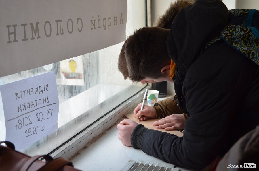 «Я знаю Андрія три роки, ми познайомились на арт-реабілітації у «Лісовій пісні», коли Андрій поклав автомат і взяв пензлик. З того часу він володіє ним досконало», - зауважила творчий наставник Андрія Соломіна Тетяна Мялковська. Жінка подарувала атовцю книги, побажавши, щоб ті стали йому провідником і опорою в житті. Це, зокрема, книги Ніка Вуйчича «Життя без обмежень. Шлях до неймовірно щасливого життя», Джима Коллінза «Величні за власним вибором» та Барбари Шер «Мистецтво мріяти».