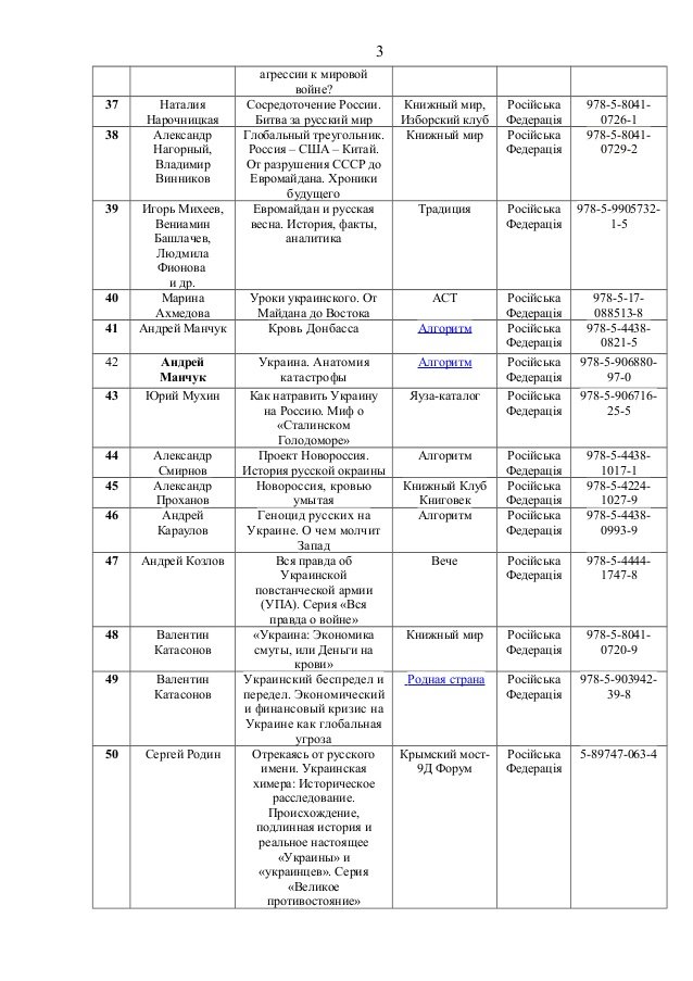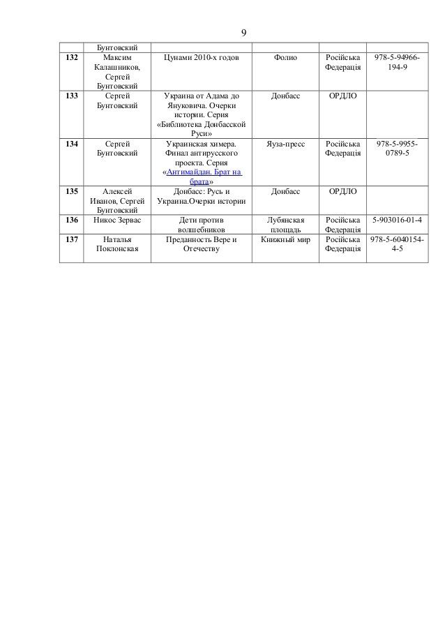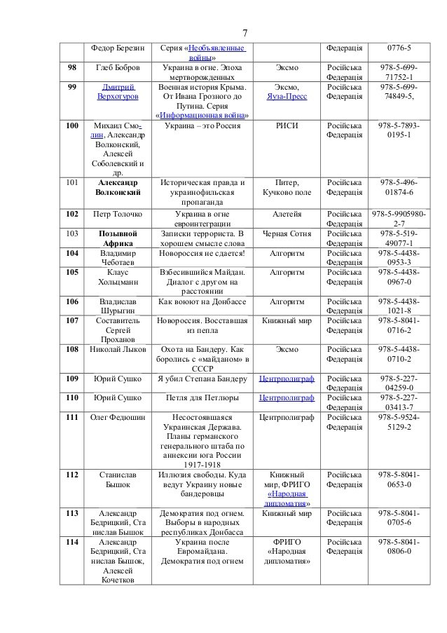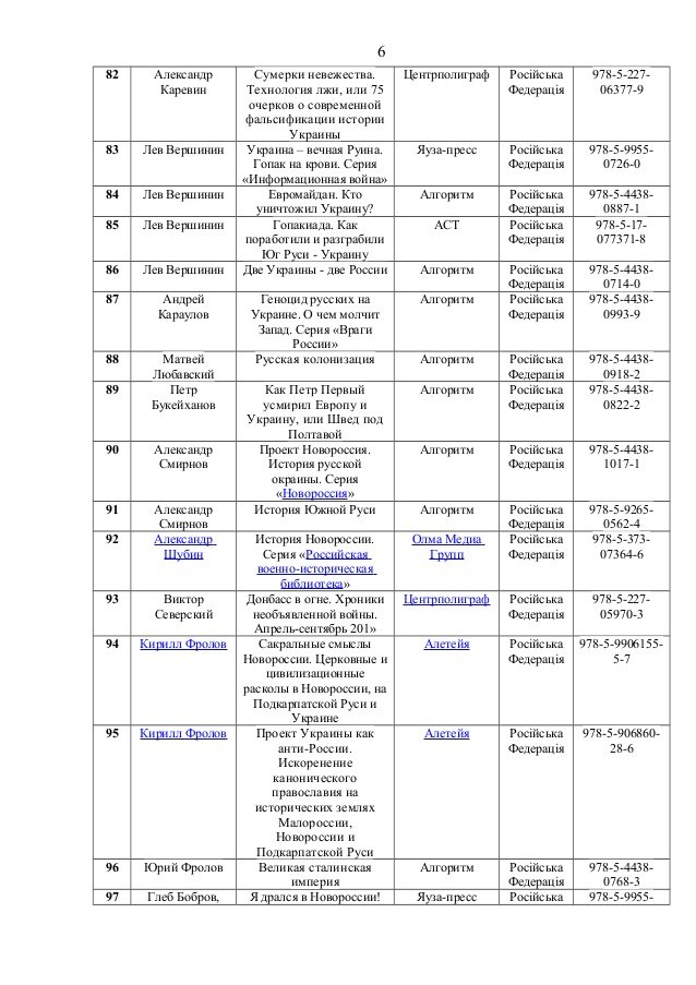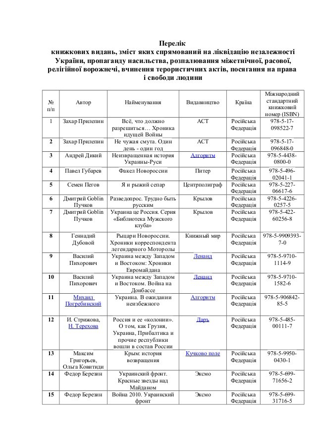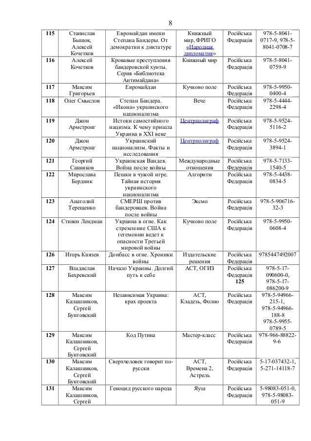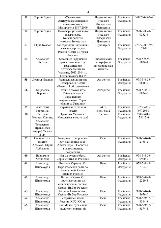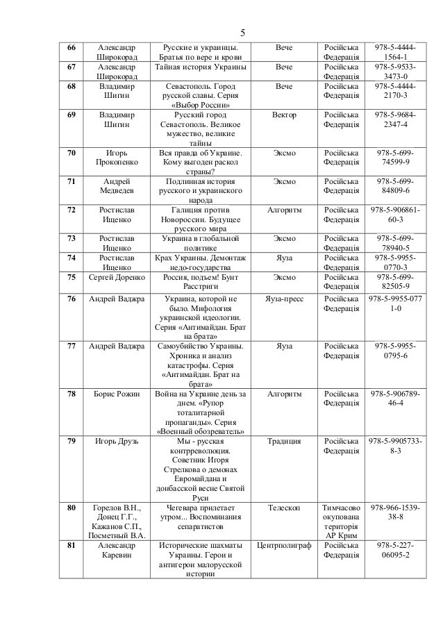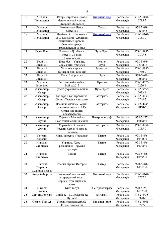 До переліку потрапили книги таких авторів, як Олександр Дугін, Сергій Доренко, Едуард Лімонов, Павло Губарєв, Сергій Глазьєв, Анатолій Вассерман тощо.