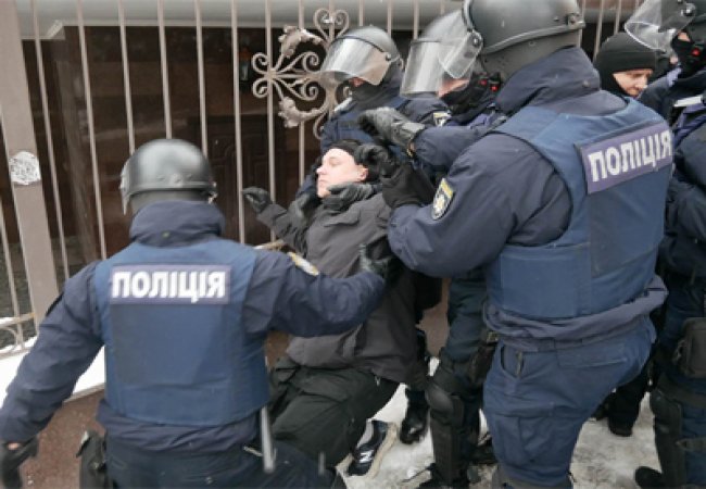 Пролунали постріли, після чого поліція повалила на землю протестувальників і затримала одного із них, повідомляє «Громадське».