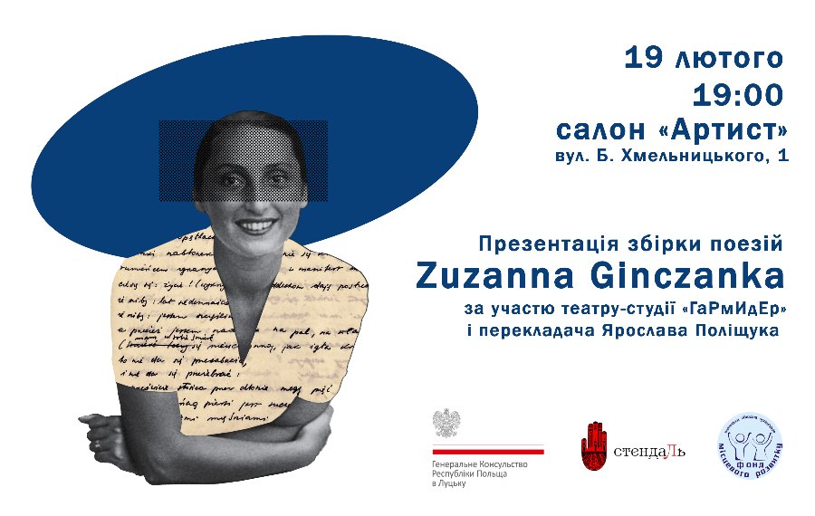 19 лютого, о 19:00, в мистецькому салоні «Артист» (вул. Богдана Хмельницького, 1) відбудеться презентація збірки поезій видатної польської поетеси Зузанни Поліни Ґінзбург (1917–1944), більш відомої під літературним псевдонімом Зузанна Ґінчанка.