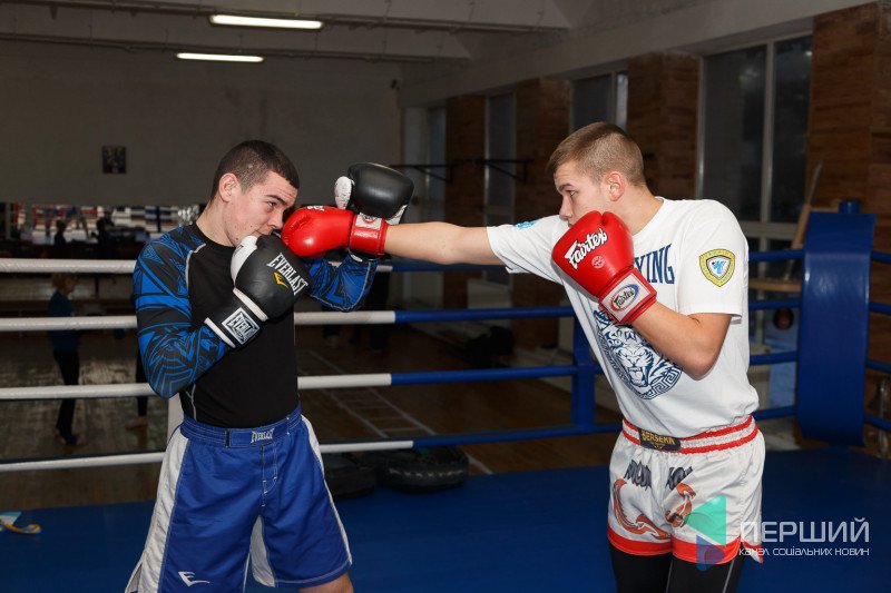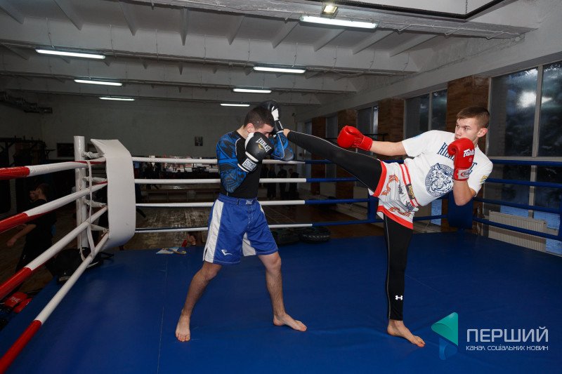 У цей момент на ринзі спарингують два кікбоксери: дивує спритність ніг та швидкість червоних рукавичок. Один з них – трьоєкратний чемпіон України з кікбоксингу у ваговій категорії до 81 кг Максим Новосад: