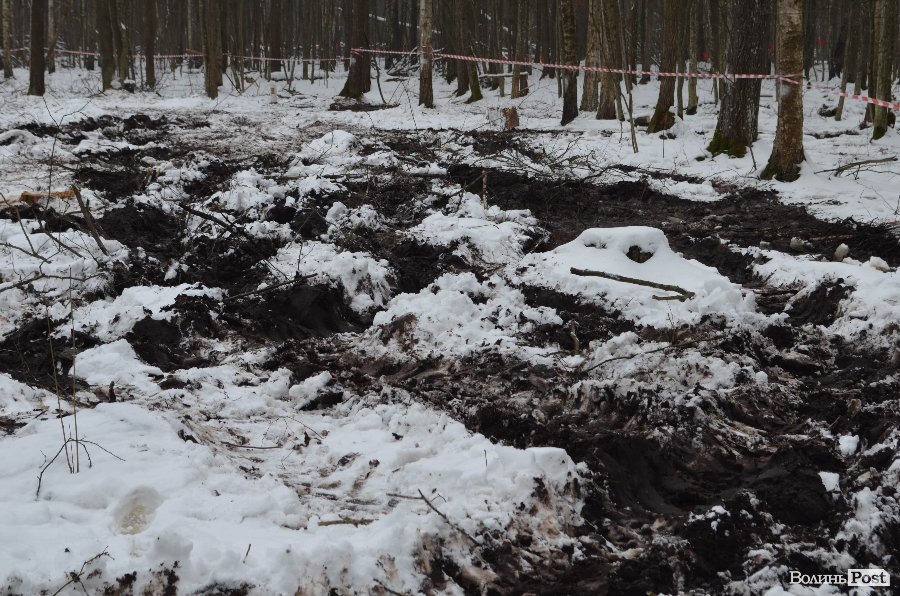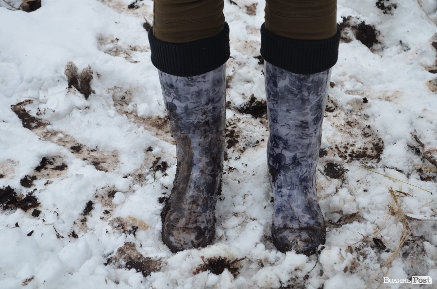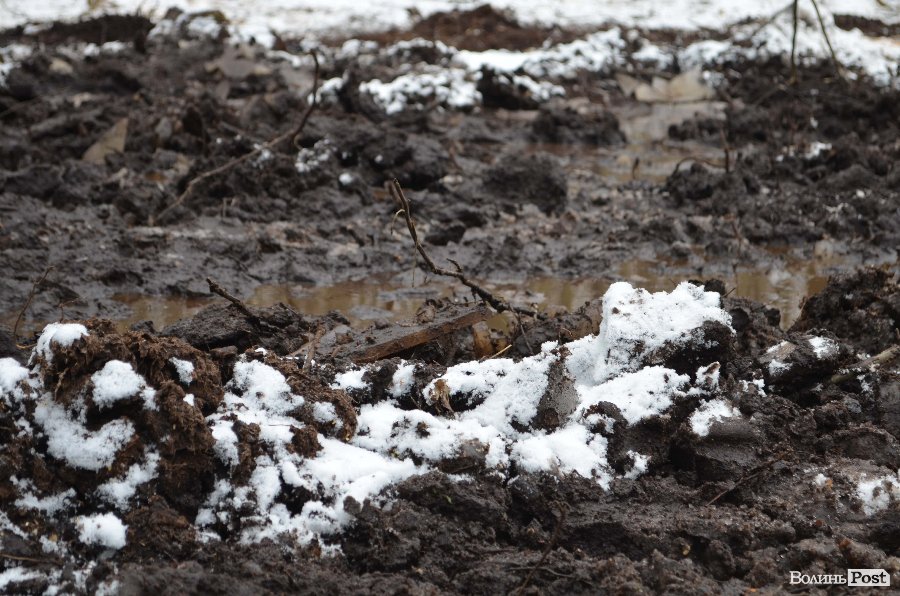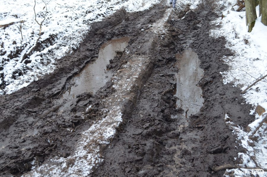 Тут розуміємо, що на першій ділянці все було не так і погано: глина прилипає до чобіт, іти важко та слизько. Обабіч дороги - рови, заповнені водою, а ліс понищений буреломами.