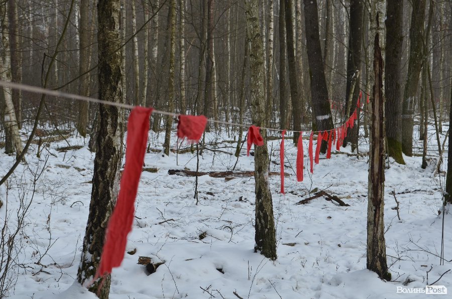 Показують застережні знаки з написом «Прохід та проїзд заборонено. Валка лісу»; червоні стрічки та прапорці.