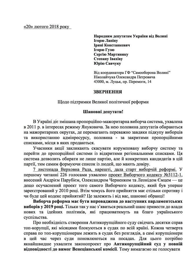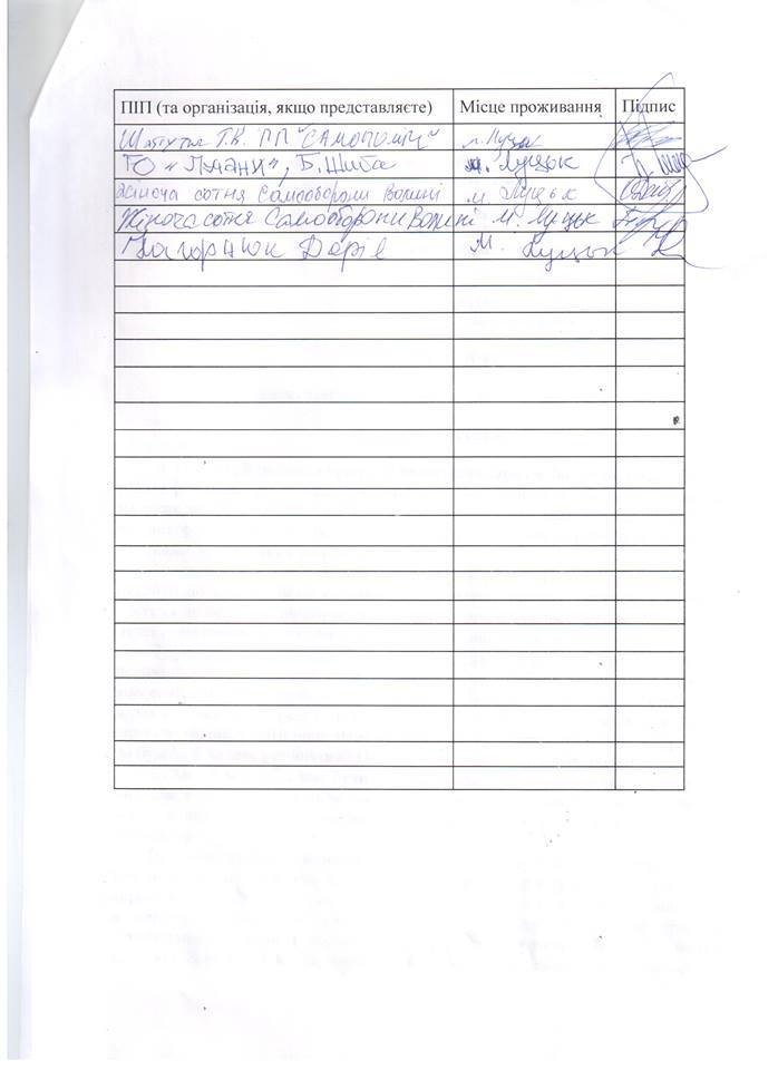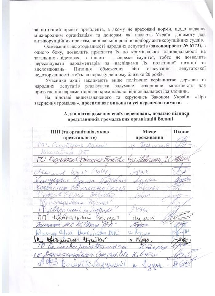 "Звернення одразу підписали на місці представники ряду громадських організацій та політичних партій: "Самооборона Волині", "Автомайдан України", "Національний корпус", "Народний контроль", "Самопоміч", "Громадянська позиція", "Рух Нових Сил", "Козацьке Стрілецьке Братство", "ЦРУ", "Центр UA", "Асоціація фермерів та приватних землевласників Волині", "Варта громади", "Лучани" та ряд інших організацій та мешканців області", - написав у Facebook активіст Богдан Климчук.